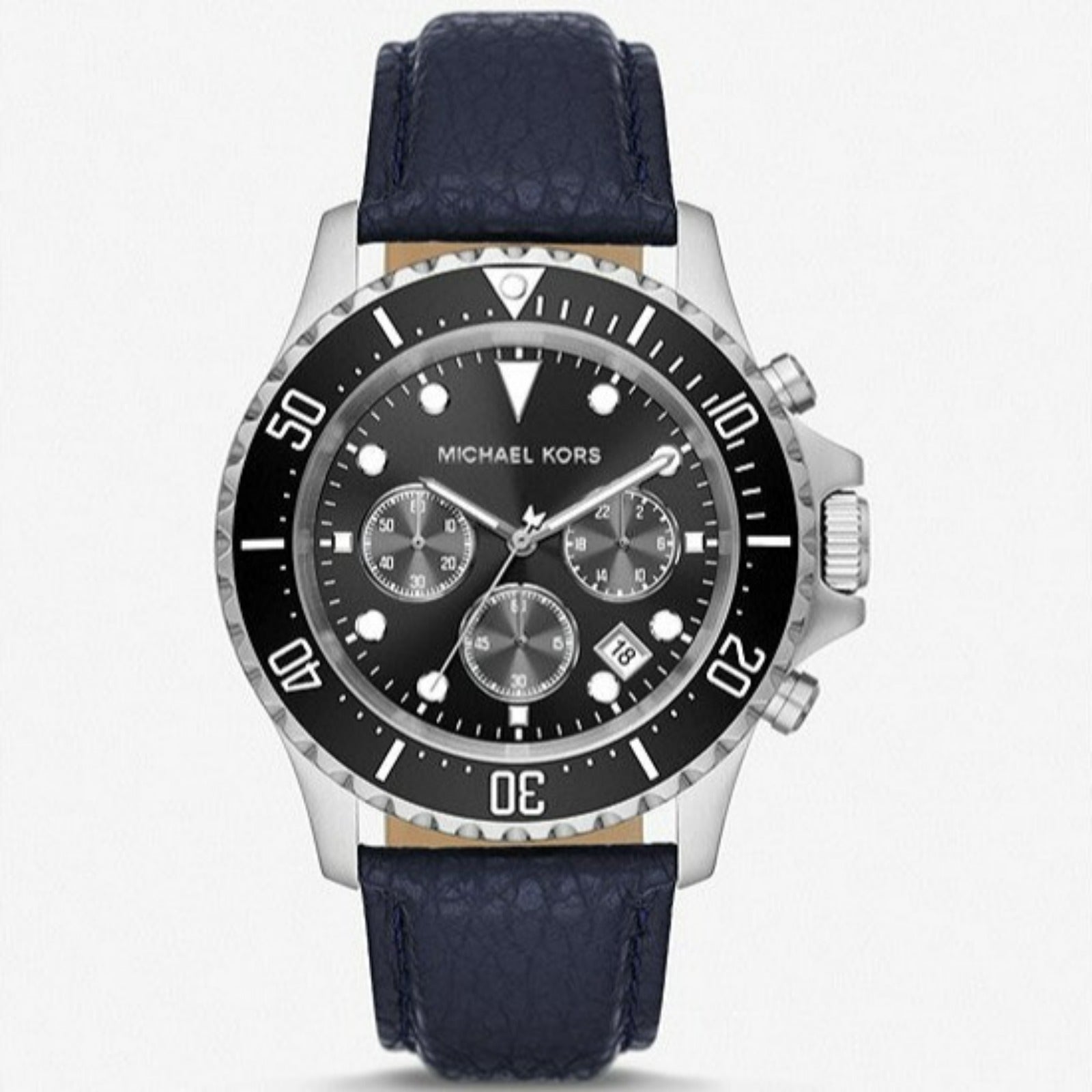 The iconic Everest watch returns, updated with a refined pebbled leather strap. A silver-tone stainless steel case promises to stand up to endless wear and turns to reveal Michael’s signature, while the bold black dial features chronograph details and a date window for added functionality.