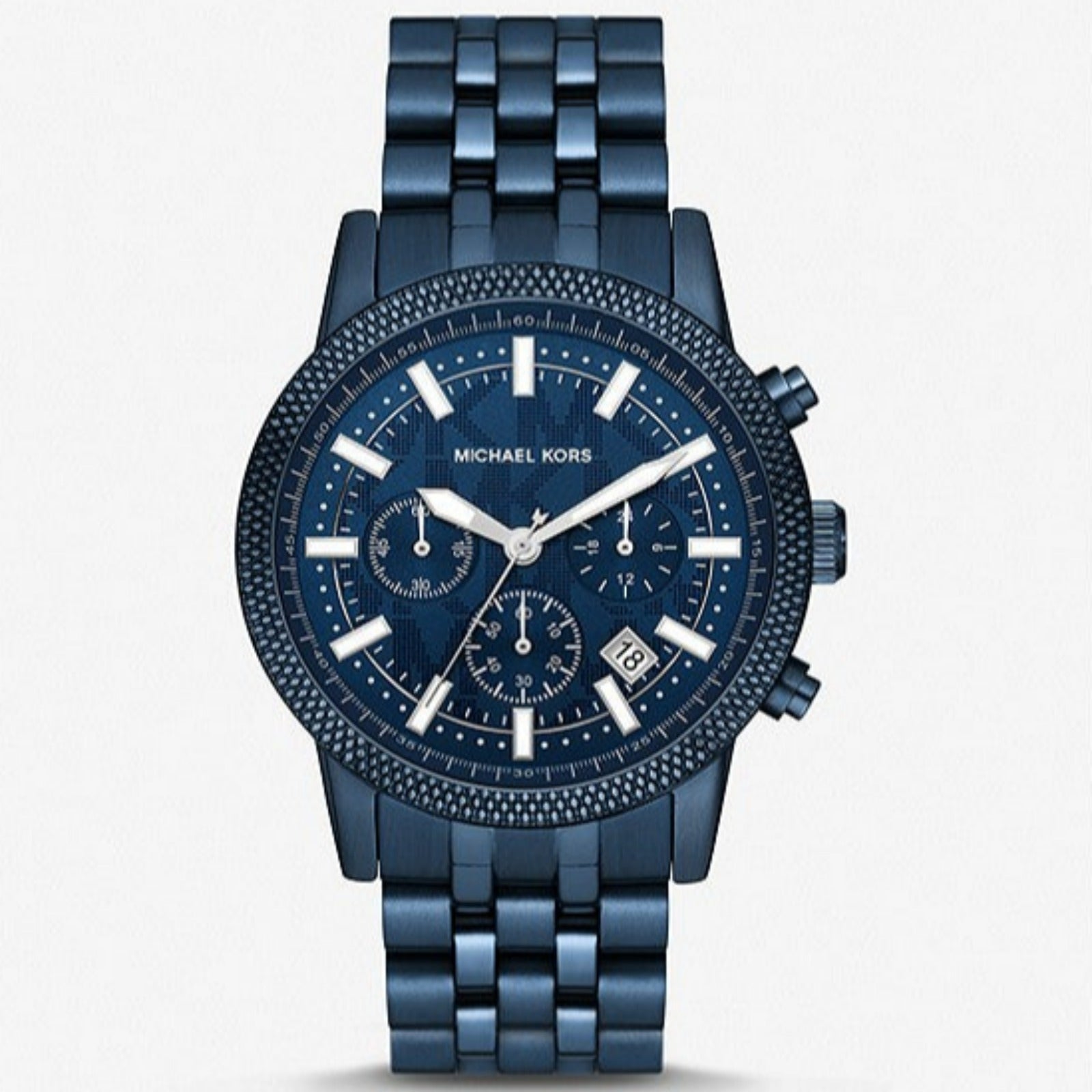 Designed for those who appreciate the luxury of time, our Hutton is the statement watch to own. A chronograph display delivers precision timekeeping, while navy-tone stainless steel craftsmanship ensures it will stand up to endless wear. A textured topring and “MK” print dial lend a subtle yet sophisticated finish.