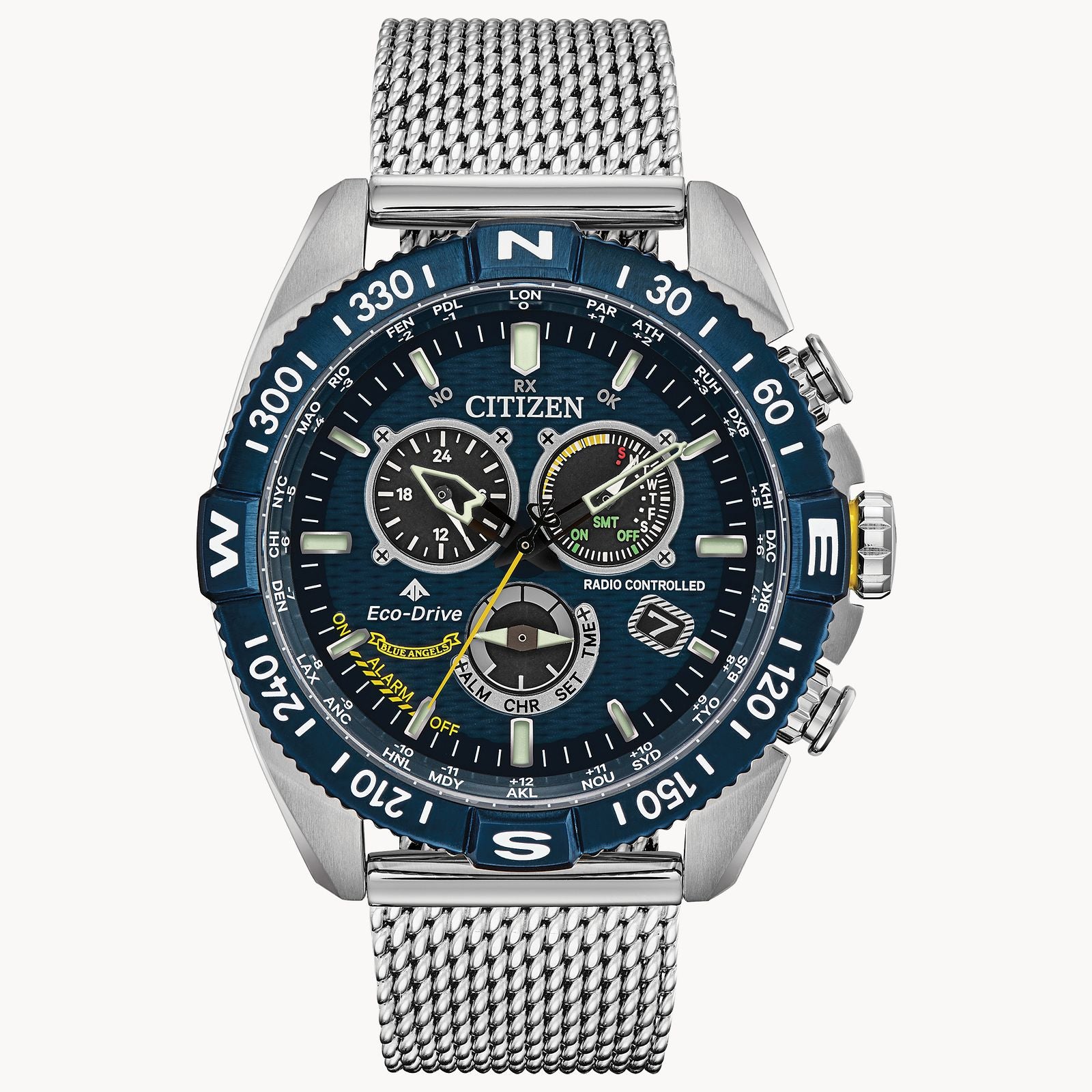 Description: Soar to new heights with the modernized CITIZEN® Promaster Blue Angels Navihawk timepiece. A radio-controlled chronograph with all the tools for professional use, featuring world time 24 time zones, 12/24-hour time, an alarm, a perpetual calendar, a power reserve indicator, a rotating compass bezel, a sapphire crystal, and luminous hands and markers. Shown here in a stainless steel case and mesh bracelet with distinguished yellow accented navy blue dial and the added value of anti-magnetism and shock resistance. Featuring our Eco-Drive technology – powered by light, any light. Never needs a battery.