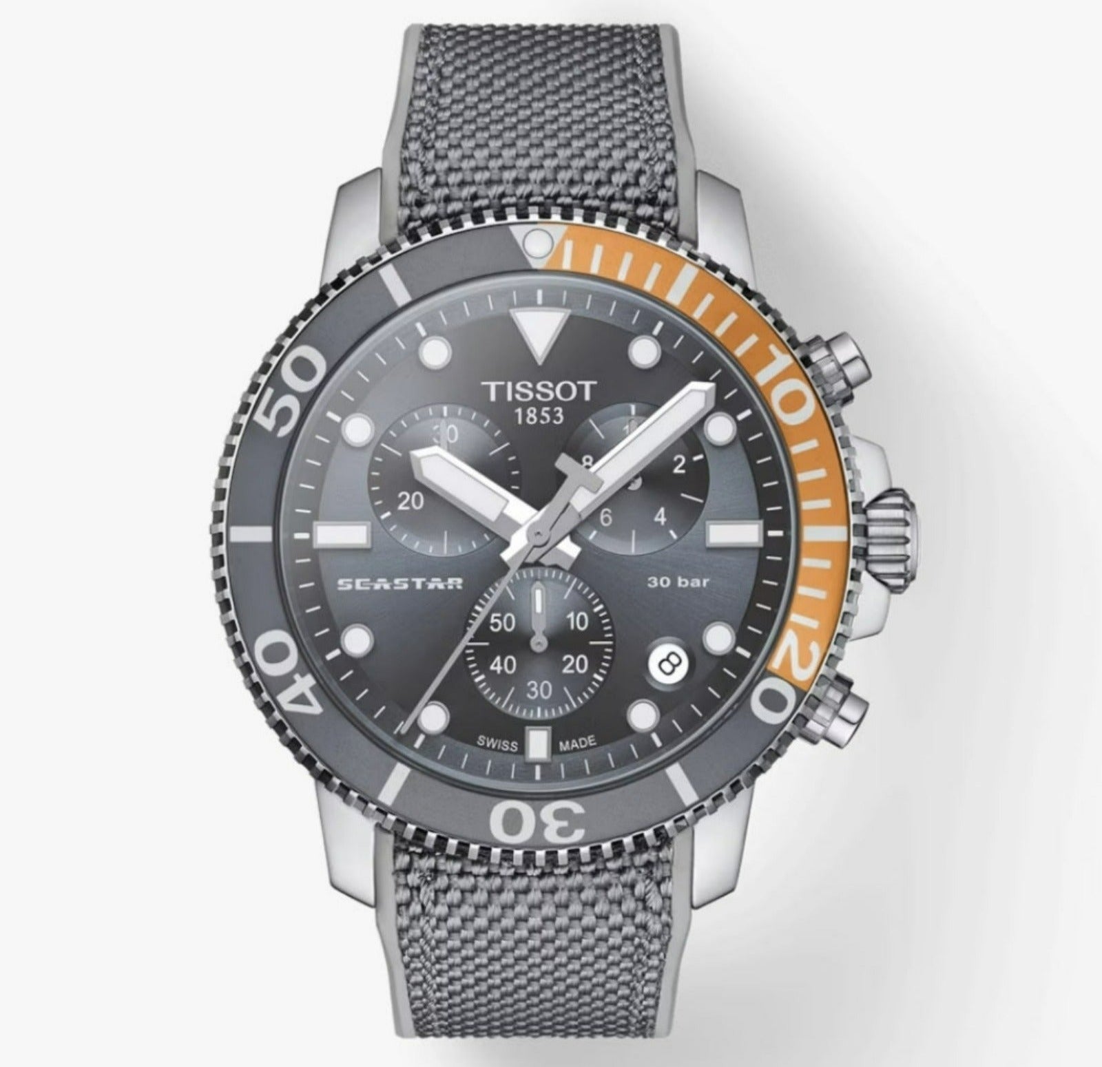 • The ultimate sophistication in diving equipment, both aesthetically and technically, the Tissot Seastar 1000 Chronograph embodies style and performance without compromise. Perfectly reliable up to a pressure of 30 bar (300m), it is proof that an underwater sports watch and a chronograph can be reconciled in one object. The diving theme is omnipresent with elements such as a unidirectional aluminum bezel, luminescent hands and indexes. Finally, the Tissot Seastar 1000 collection offers a multitude of choices of compatible straps.