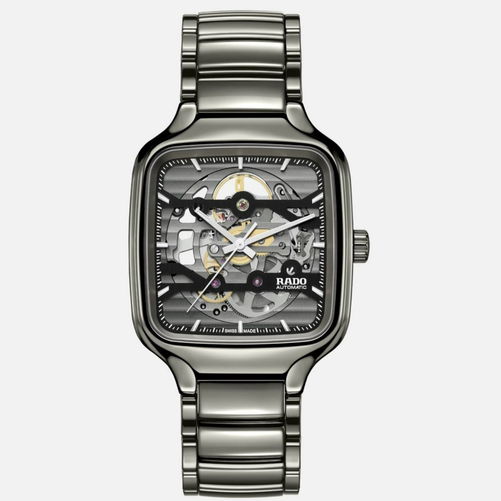 The new True Square Skeleton adds another highlight to the popular Rado True Square collection. What catches the eye is the R808 skeletonised movement and the two-level dial, which practically merges with the movement. This state-of-the-art calibre delivers outstanding precision combined with enhanced resistance to magnetic fields and variations in temperature, and has a power reserve of 80 hours. The bridge and top plate are coated in anthracite colours. With the 38mm monobloc case and the bracelet made of polished plasma high-tech ceramic, the True Square Skeleton presents characteristic Rado features in a fascinating form.