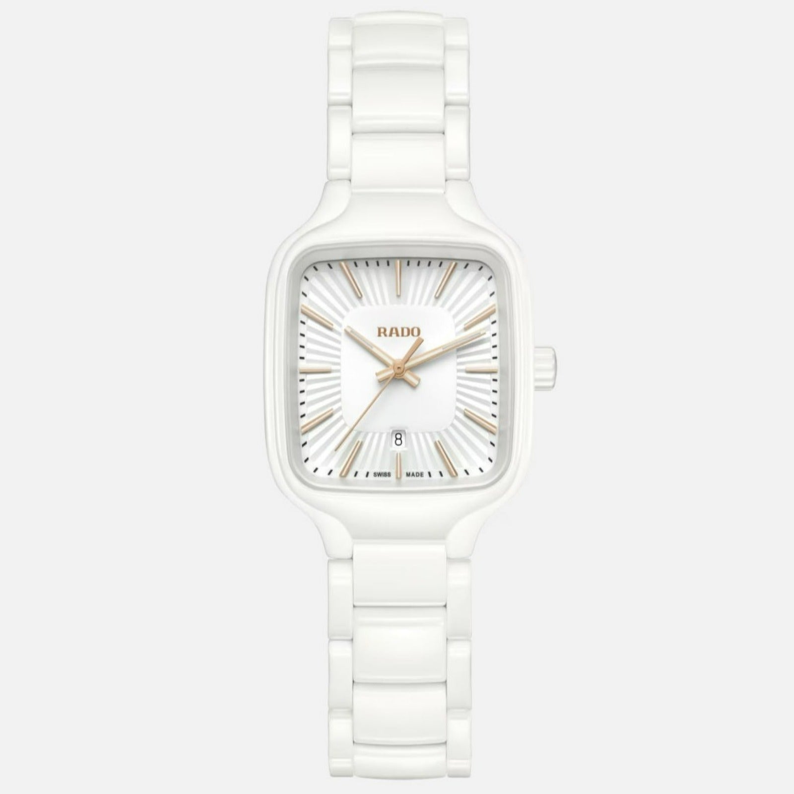 The True Square has a diameter of 29 mm and consists of a polished white high-tech ceramic case and crown and a flat sapphire crystal. Thanks to a Rado R079 quartz movement, the watch keeps precise and reliable time. The rose gold coloured hands and indexes with white Super-LumiNova® match perfectly with the dial that includes a white radially pleated stamped structure. The watch has a water resistance of 5 bar. The pleasant wearing comfort of the True Square is ensured by a white polished high-tech ceramic bracelet with a titanium 3-fold clasp.
